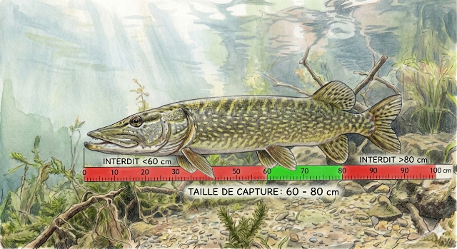 Contrairement à la réglementation actuelle chez nous qui nous impose de remettre à l'eau les brochets de taille inférieure à 60 cm, la fenêtre de capture, c'est remettre à l'eau les plus petits brochets, souvent en dessous de 50 cm et les gros brochets qui sont les meilleurs géniteurs, supérieurs à 70 voir 80 cm.
