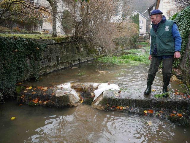 22 novembre 2018: Avec les petites pluies, le débit de la source est légèrement plus important. Yves retire le filet qui retenait les truites en amont des travaux. La partie centrale du barrage qui doit disparaitre ne sera retiré que lorsque le niveau sera plus important.