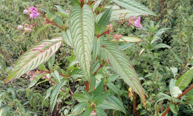 La balsamine de l’Himalaya est une plante annuelle qui développe de jolies fleurs roses variant du blanc au pourpre. La floraison commence en juillet pour s'étaler jusqu'en octobre. Elle peut atteindre jusqu’à 2 mètres de hauteur. Ses feuilles allongées et pointues ont les bord très nettement dentelés. La tige est creuse et rougeâtre avec des nœuds renflés. Les graines sont contenues dans des capsules qui peuvent mesurer jusqu’à 3 cm et qui explosent pour projeter les graines à plusieurs mètres de distance. Les plantes étant souvent à proximité de l'eau, la dispersion des graines se fait souvent grâce au courant. La colonisation en aval est donc inévitable.